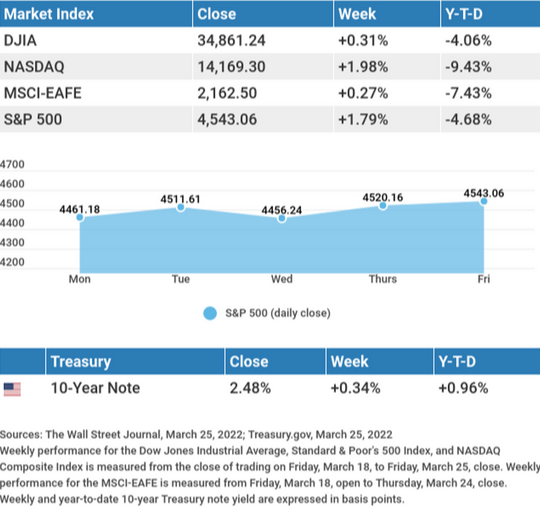 Markets bounced around all last week as investors grappled with the crosswinds of rising yields, continued hostilities in Ukraine, and hawkish comments from Fed Chair Jerome Powell. After suffering declines in two of the first three trading sessions of the week, stocks turned higher on a good jobless claims number that investors interpreted as continuing economic strength.