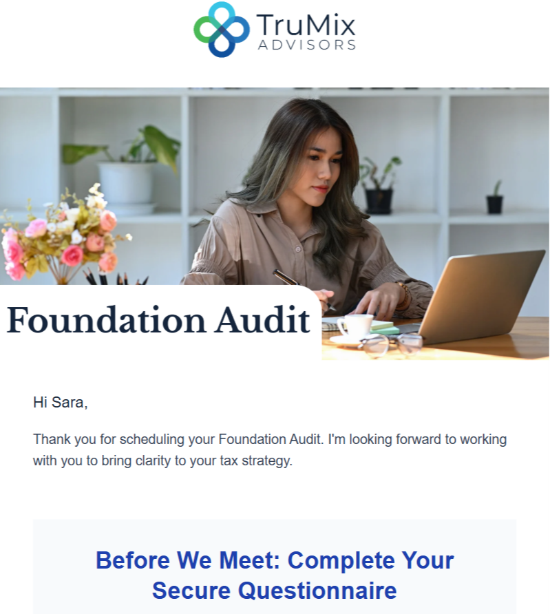 Why this matters: Completing the data form prior to our meeting allows us to build your custom plans in advance, making our time together much more productive.