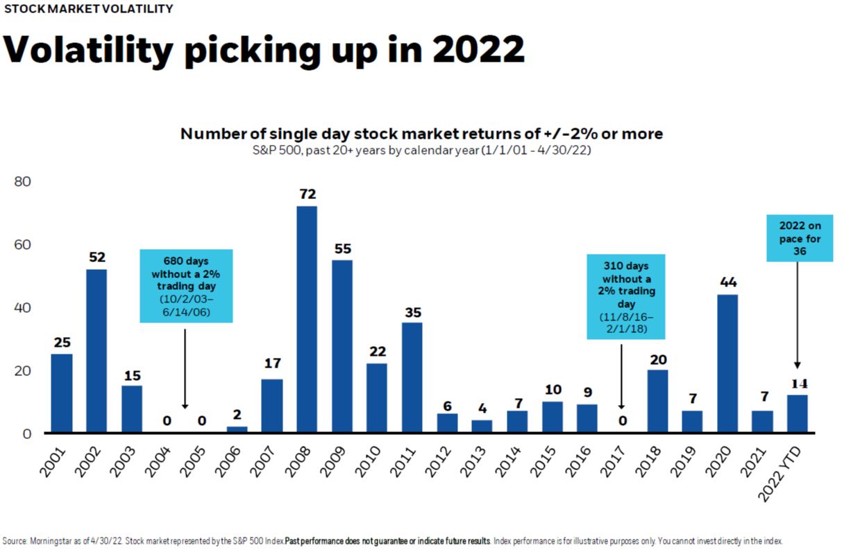 As we alluded to earlier this year, market volatility is on the upswing for 2022. Many factors contribute to this increased volatility, including inflation, rising interest rates, the war in Ukraine, and the fact that it's a midterm election year. The chart below defines volatility as the number of single day stock market returns plus or minus 2%. 2021 was a quiet year in the market, but as you can see 2022 is shaping up differently, already doubling the number of 2% days compared to last year. So, if you're feeling like the market is wilder lately, you'd be right!