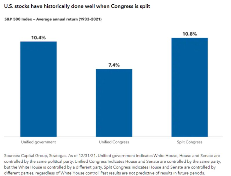 The outcome of next week's election is unclear with some forecasting a split Congress and others' a republican sweep. Historically speaking, the S&P 500 performs better when Congress is split as you can see in the chart below. Of course, past performance doesn't indicate future results and any one statistic doesn't tell the whole story.
