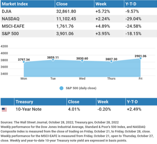Meanwhile, positive earnings surprises from “old economy” companies powered markets higher. This market bifurcation was evident in the divergence in the performance of the Dow Industrials and the Nasdaq. The S&P 500 posted a substantial gain despite its disproportionate weighting of mega-cap stocks, which helped illustrate the power of the rally. Momentum accelerated into Friday, aided by an easing in inflation and a solid third-quarter Gross Domestic Product (GDP) report.